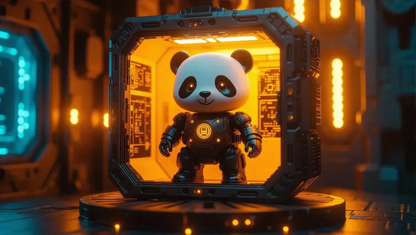 A toy robot panda with matte gray and bright yellow panels stands on a rotating platform inside its packaging. The box pulses with kinetic energy effects, featuring vintage logos and a QR code that unlocks hidden levels. Set in a classic toy assembly facility, the scene is illuminated by warm, orange lights casting soft shadows, emphasizing the nostalgic and cozy setting. The style is charming and whimsical, blending realism with retro aesthetics.