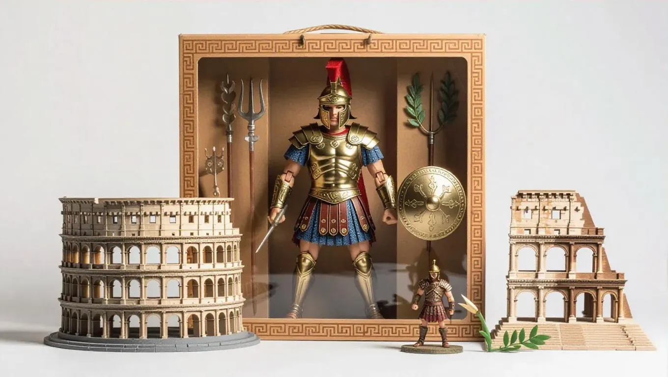 A high-quality product photograph of an action figure box set featuring a Roman gladiator. The action figure is packaged inside an ancient Roman-themed cardboard box with a clear front window. The figure, detailed and slightly stylized, wears a helmet and gladiatorial armor. Included are a miniature coliseum, a shield, a trident, and a tiny laurel wreath. Studio style, clean background, professional lighting, emphasizing the intricate details and premium packaging.