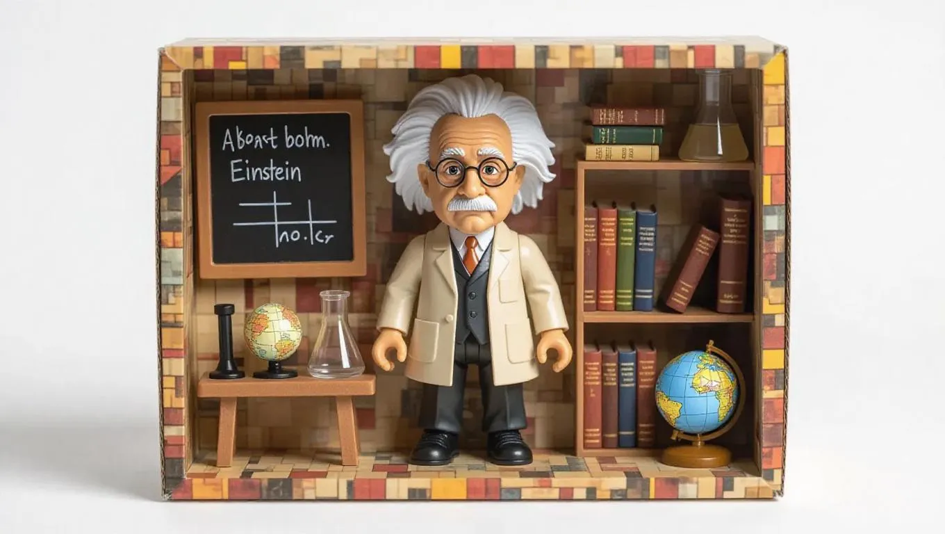 A high-quality product photograph of an action figure box set featuring Albert Einstein. The action figure is packaged inside a science-themed cardboard box with a clear front window. The figure, detailed and slightly stylized, wears a lab coat and has wild, unkempt hair. Included are a miniature blackboard, a set of physics books, a beaker, and a tiny globe. Studio style, clean background, professional lighting, emphasizing the intricate details and premium packaging.