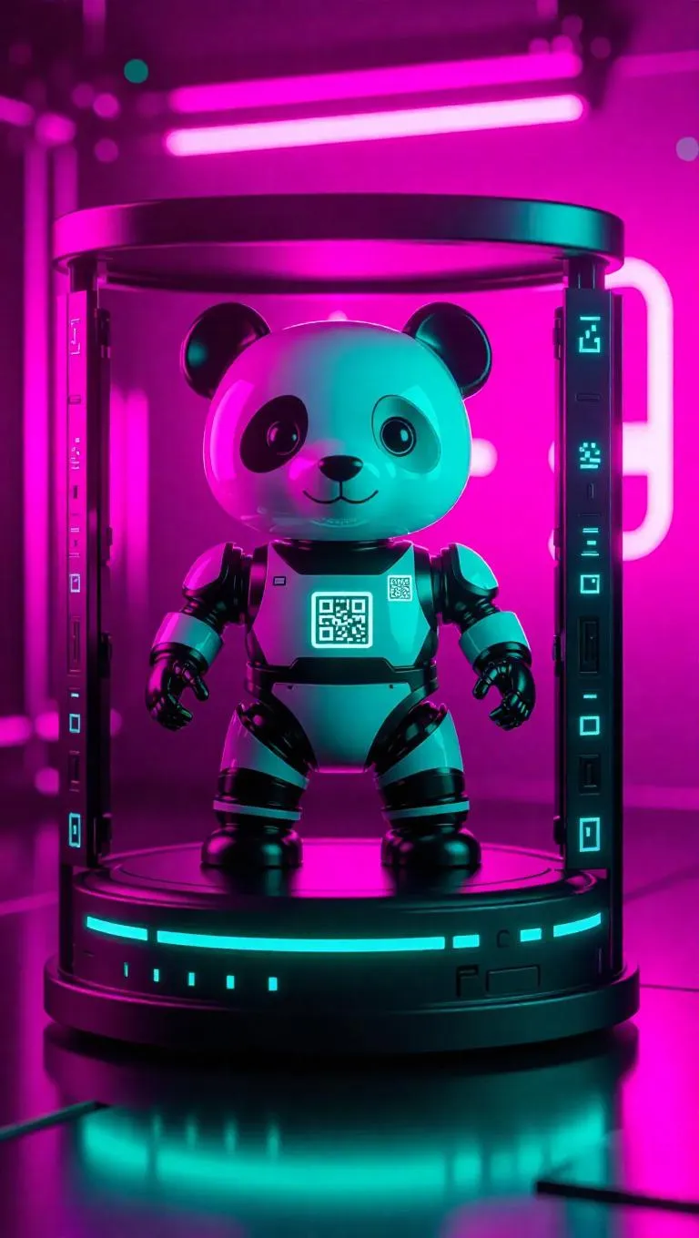 A toy robot panda with mint green and bright red panels stands on a rotating platform inside its packaging. The box pulses with kinetic energy effects, featuring pixelated logos and a QR code that unlocks challenges. Set in a digital toy assembly facility, the scene is illuminated by dynamic, purple lights casting abstract shadows, emphasizing the digital and innovative setting. The style is energetic and bold, blending realism with digital aesthetics.
