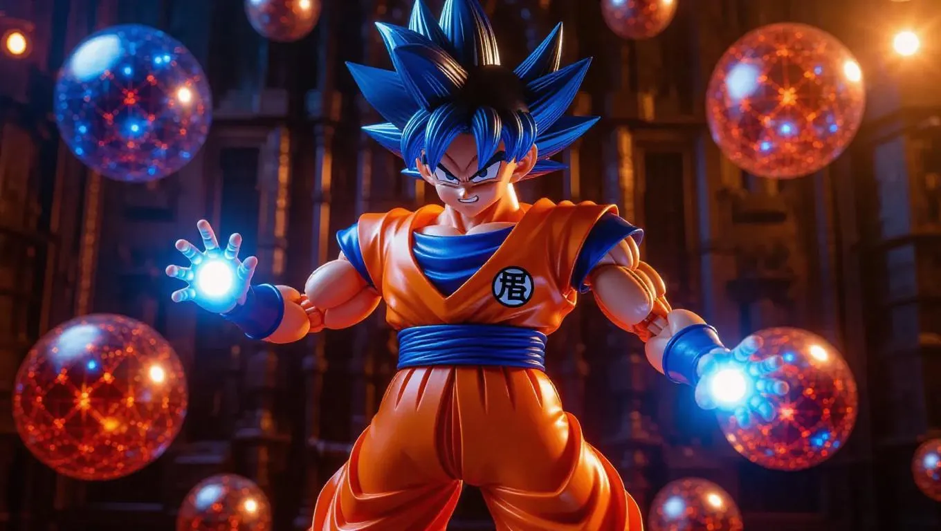 A high-gloss orange and blue robotic Goku mech figure with animated energy aura hair and a Kamehameha-launching arm stands emphatically. The figure's packaging is adorned with dragon ball-themed designs and energy orb-shaped holographic labels, including bonus gear arms. The background showcases a dynamic toy factory filled with floating mechanical dragon balls and an exciting, vigorous atmosphere. Soft, warm light casts gentle highlights on the figure, enhancing its glossy finish. Style: Adorable and futuristic with a touch of cyberpunk flair.