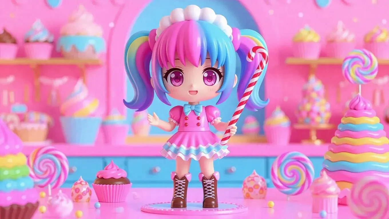 A candy-colored anime girl action figure, dressed as a magical pastry chef, sports frosting-themed hair, a candy cane scepter, and chocolate boots. The toy box showcases rainbow swirls and shiny pearlescent candy patterns, along with bonus mini-figures. The background depicts a dessert workshop creating sweets-themed toys, bathed in soft, dreamy light with a touch of glittery highlights. Style: Chibi anime with a playful, colorful aesthetic.