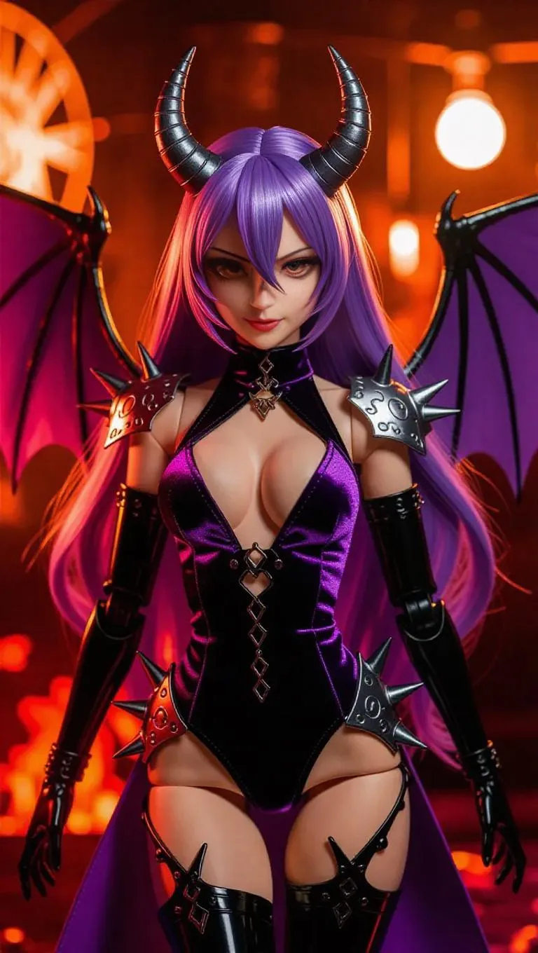 A seductive demon girl action figure with metallic gray horns, sleek dragon wings, and a flashy velvet latex outfit adorned with silver spikes. Her long, flowing lavender hair shimmers, and her amber eyes have a devilish twinkle. The toy packaging features occult engravings, warm luxurious textures, and a transparent blood-streaked window. In the factory, blazing molds and thick clouds surround the assembly lines, creating a forbidden, dark atmosphere. Lighting is softly menacing with warm highlights and stark contrasts. Style: Dark Fantasy, Gothic.