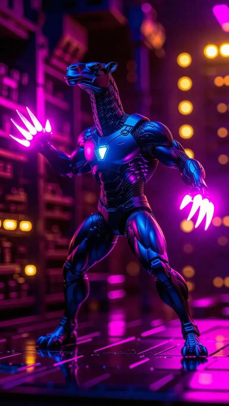 A 1:6 scale superhero camel figure stands in a striking pose, wearing a dark blue nano-suit with illuminated plasma claws. The figure's strong motion is captured with premium box inserts featuring dramatic motion lines and comic-style effects. Set against a high-energy toy workshop, the scene is illuminated with vivid purple and dazzling yellow lights, creating a futuristic and vibrant atmosphere. Style: Hyper-realistic with a touch of comic book flair.