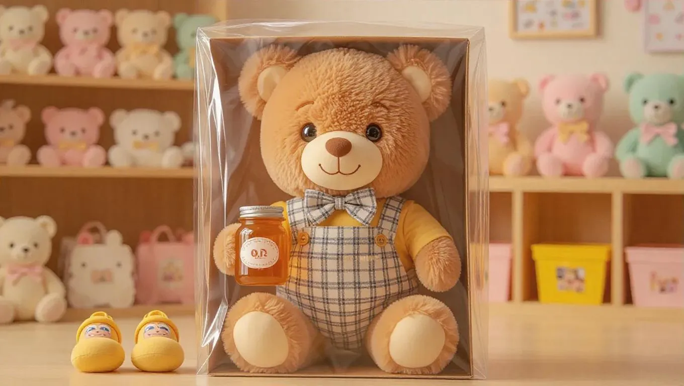 C4D, a soft brown paper toy box is completely wrapped in transparent plastic film. The box body has a large observation window to show the inside. A 3D cartoon-style teddy bear doll is wearing plaid overalls with a cheerful yellow shirt, soft light brown fur, a round face with button-like eyes and stitched eyebrows, a little bow tie and floppy ears, holding a honey jar cup, and wearing cozy slippers. The package contains two changeable bow ties and three pairs of fuzzy shoes of different styles. The background features a cozy toy store display stand in warm pastel tones. The plastic packaging film reflects the ambient light, presenting a plushy texture. The overall picture is full of the warmth of a collectible figurine.