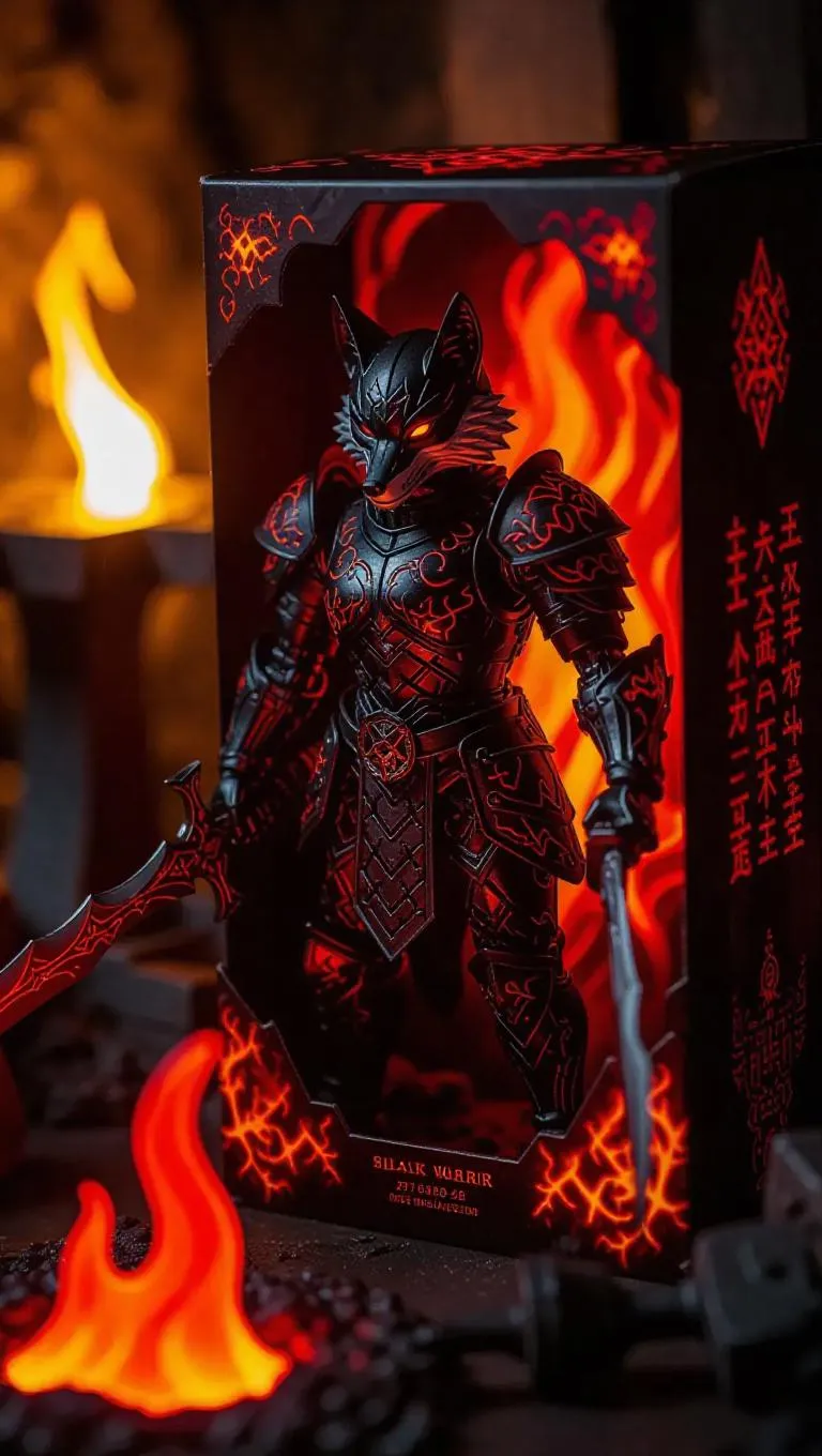 A sleek fox warrior toy clad in red and black armor with intricate fiery patterns, wielding a dual-edge sword. The box showcases a volcanic scene with lava flows and ancient runes, including a rugged pouch for accessories. Set in a blacksmith forge with anvil and hammers, illuminated by bright furnace flames, enhancing the toy's powerful design. Style: Realistic.