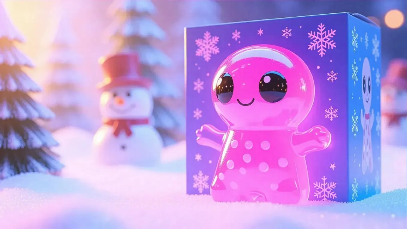 A toy alien jelly figure made of frosty gelatin material, featuring cheerful eyes and swirling ice-like trails. The box is illustrated with winter-themed graphics, including a snowflake-shaped accessory and frosty accents. The factory setting is a snowy toy production zone, complete with snowmen and winter paraphernalia. Cool, icy lighting enhances the gelatinous texture, creating a chilly and fun atmosphere. The style is festive and slightly nostalgic, merging winter themes with colorful designs.