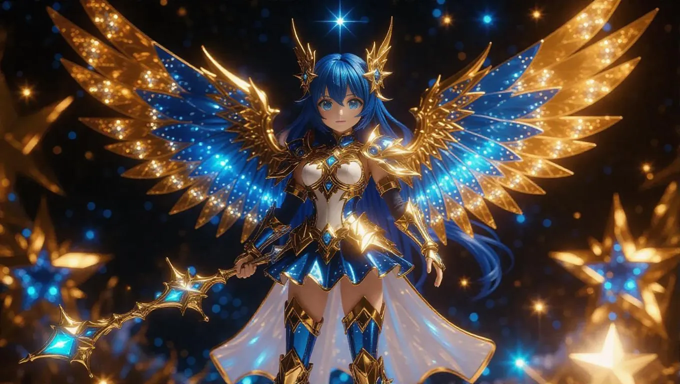 A magical girl action figure with dazzling gold and blue wings, a celestial staff, and sparkling eyes stands in a victorious pose. Her toy box is adorned with radiant constellations and features her in an exalted magical stance, complete with additional cosmic accessories. The background is a starry toy workshop, illuminated by bright, shimmering light that highlights the colors and adds a magical atmosphere. Style: Realistic with cosmic elements.