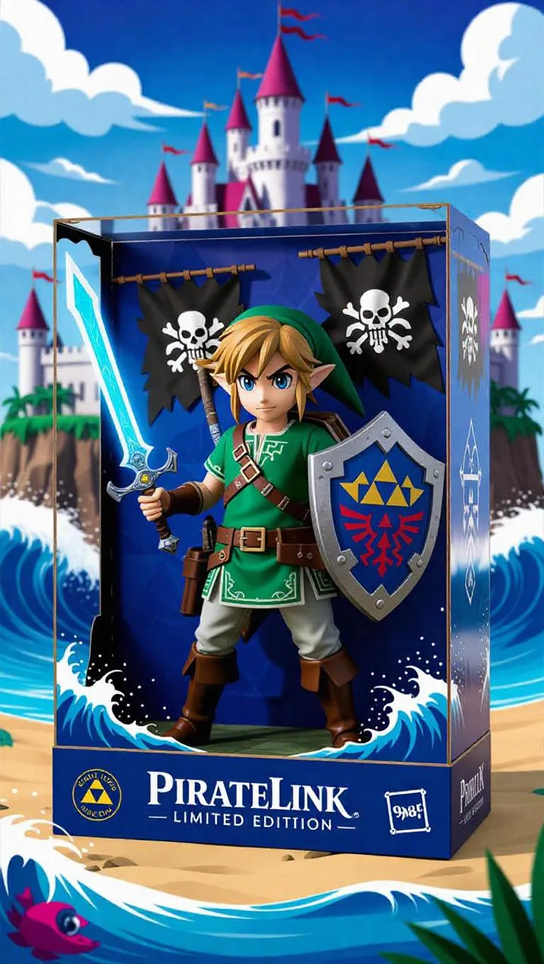An anime-style collectible action figure of Link, reimagined as a pirate captain with rugged attire, glowing blue cutlass, and tattered flag shield. Displayed inside a transparent premium toy box with oceanic linings, Triforce stickers, and 'PirateLink Limited Edition' branding. Background: coastal Hyrule Castle with crashing waves, sea monsters, and tropical vibes. Style: nautical adventure.