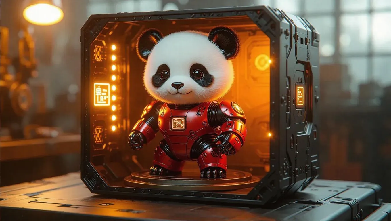 A toy robot panda with glossy red and silver panels stands on a rotating platform inside its packaging. The box pulses with kinetic energy effects, featuring abstract logos and a QR code that unlocks new character skins. Set in a steampunk toy assembly facility, the scene is illuminated by soft, amber lights casting gentle shadows, emphasizing the whimsical and vintage setting. The style is ornate and detailed, blending realism with steampunk aesthetics.