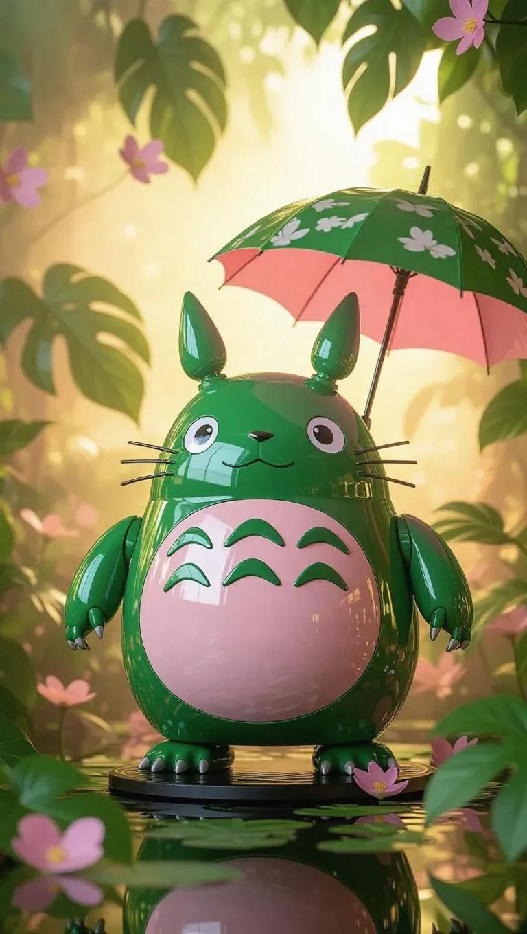 A high-gloss green and pink robotic Totoro mech figure with vine-inspired wings and a nature-launching umbrella stands prominently. The packaging features botanical-themed designs and petal-shaped holographic labels, including bonus gear leaves. The background showcases a vibrant toy plantation with floating mechanical leaves and a lively, plant-inspired atmosphere. Soft, warm light casts lively highlights, enhancing the glossy finish. Style: Fresh and lively with a touch of botanical flair.