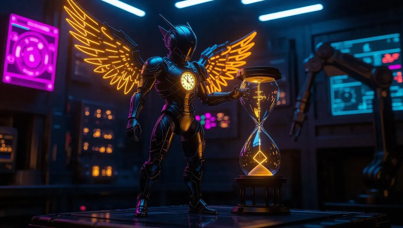 A time traveler action figure with intricate clock-shaped wings and an hourglass staff glowing with radiant golden light. Wears a sleek outfit adorned with digital circuit motifs. The toy box showcases a futuristic design with neon lights. Background: A high-tech laboratory filled with holograms, robotic arms, and advanced gadgets. Style: Cyberpunk.