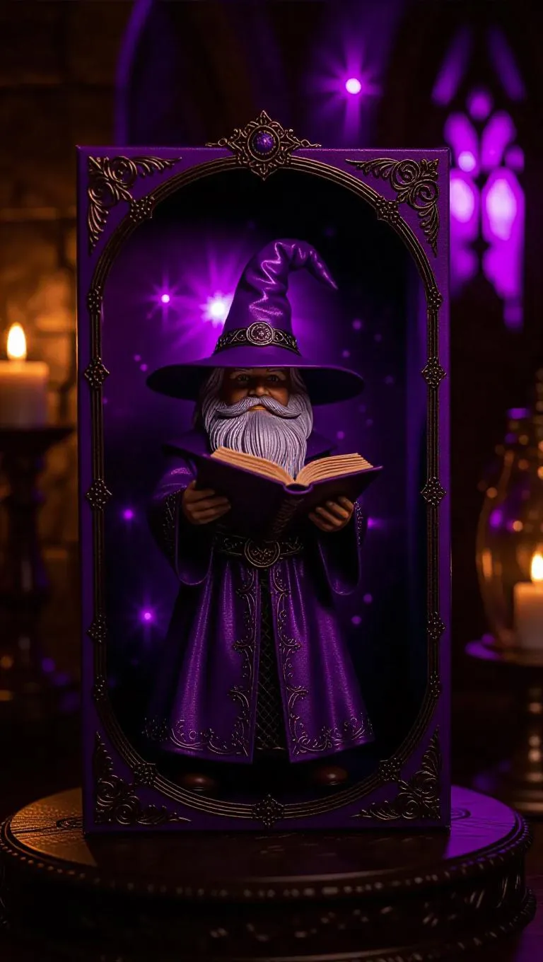 A tattered toy wizard with silver accents stands on a magical realm platform inside his fantasy-themed packaging. The box features a removable spellbook sticker. In an enchanted toy factory, deep purple lights swirl against ancient-looking walls, enhancing the mystical, whimsical atmosphere. Realistic fantasy aesthetics.
