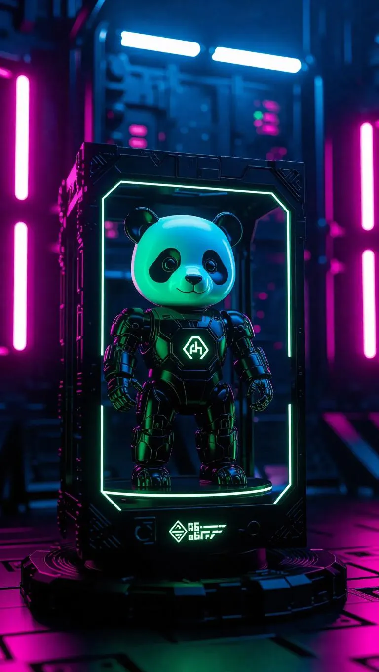 A toy robot panda with matte black and neon green panels stands on a rotating platform inside its packaging. The box pulses with kinetic energy effects, featuring geometric logos and a QR code that unlocks in-game powers. Set in a cyberpunk toy assembly facility, the scene is illuminated by harsh, blue-tinted lights casting sharp shadows, emphasizing the futuristic and industrial setting. The style is sleek and high-tech, blending realism with cyberpunk aesthetics.