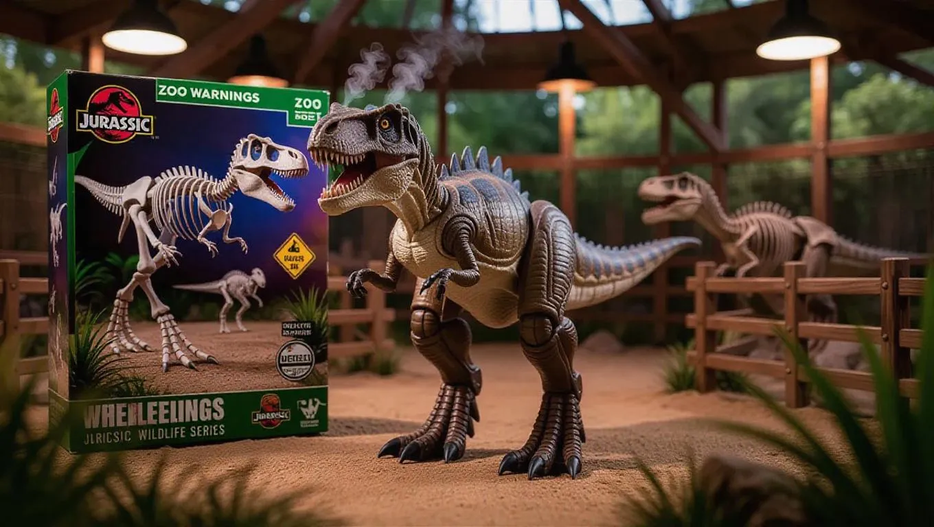 A mechanized Ceratosaurus action figure with armored feet and puffs of smoke from its nostrils stands forbiddingly in a dino-themed zoo. The figure’s box displays colorful dinosaur skeleton overlays, zoo warnings, and "Jurassic Wildlife Series" branding. Animal enclosures and viewing areas fill the background, illuminated by natural zoo lighting. The scene emphasizes wildlife conservation while highlighting the unique design of the dinosaur figure and the eco-friendly backdrop.
