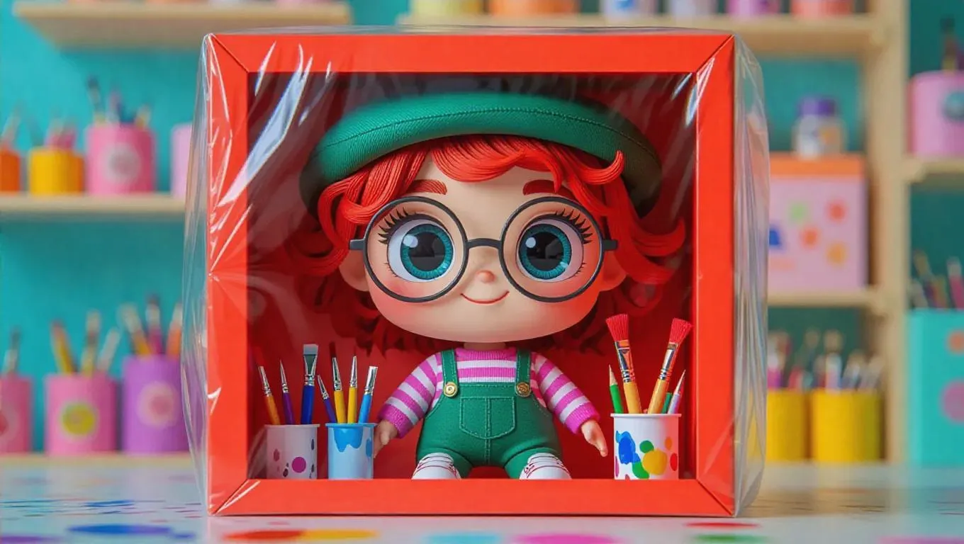 C4D, a bright red paper toy box is completely wrapped in transparent plastic film. The box body has a large observation window to show the inside. A 3D cartoon-style artist doll is wearing dark green overalls with a pink and purple striped shirt, messy auburn hair with paint splatters, a friendly face with big light blue eyes and quirky eyebrows, a beret and round glasses, holding a paint cup, and wearing canvas shoes. The package contains two changeable berets and three pairs of art shoes of different styles. The background features a creative toy store display stand in vivid tones. The plastic packaging film reflects the ambient light, presenting a painted texture. The overall picture is full of the creativity of a collectible figurine.