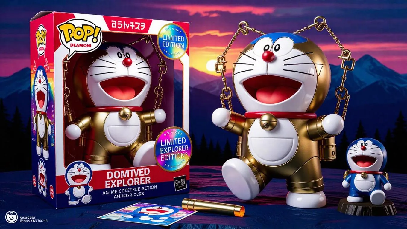 An anime-inspired collectible action figure of Doraemon in an explorer's outfit, packaged inside a premium toy box. Doraemon has a sleek, robotic redesign with shiny metallic beige armor, glowing blue eyes, and mechanical climbing gear. His signature round body is now detailed with tech panels and hiking elements, and his iconic bell and pouch are upgraded with adventurer features. The packaging features bold Japanese anime-style fonts, cel-shaded illustrations of Doraemon in action poses, and a holographic “Limited Explorer Edition” sticker. The box includes accessory parts like a climbing arm and a map tool. Background features a mountainous skyline at dawn. Style: anime-explorer, cel-shaded, high detail, collectible figure with toybox glare and dramatic lighting.