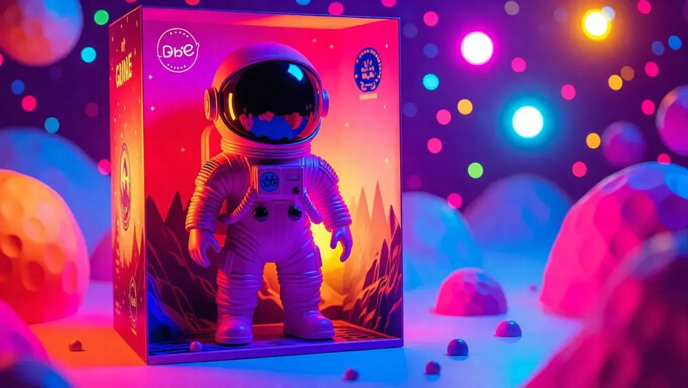 A toy astronaut clad in vibrant pink armor and frosted visors stands on a simulated alien landscape platform within its packaging. The box showcases whimsical space logos and a pull-out adventure checklist. In a colorful toy showcase, the scene is illuminated by bright, rainbow lights and cheerful-yellow indicators, casting fun, playful shadows. The setting highlights a lively, enchanting design, blending magic with playful aesthetics.