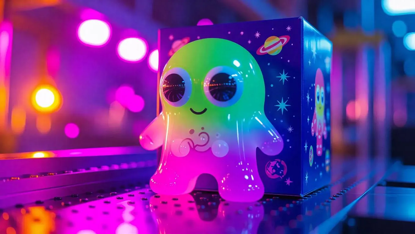A toy alien jelly figure made of vibrant jelly-like material, featuring oversized googly eyes and wobbly trails. The box is decorated with space-themed graphics, including a rocket-shaped accessory and sparkling elements. The factory setting is a colorful toy assembly line, complete with conveyor belts and flashy lights. Bright, direct lighting highlights the gelatinous texture, creating a fun and magical atmosphere. The style is playful and slightly abstract, merging real-world details with whimsical illustrations.
