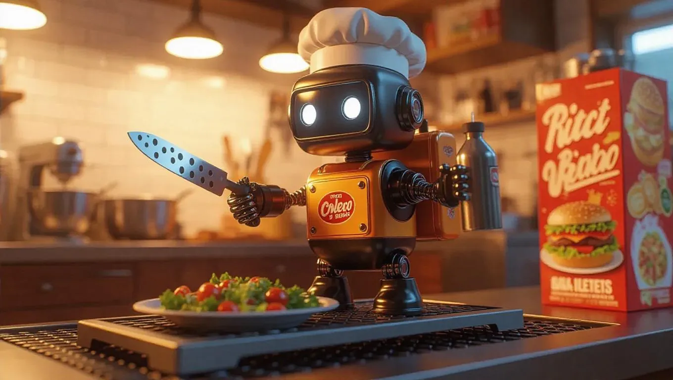 A toy robot chef with knife arms, a salad-launching backpack, and a soy sauce sprayer. The robot has a shiny, metallic body with exaggerated, cartoonish features. It stands on a kitchen-style toy conveyor belt system with frying effects, surrounded by classic diner designs and a holographic barbeque pattern on the packaging. Warm, mellow lighting highlights the robot’s vibrant colors and the dynamic action of the conveyor belt, creating a cozy and inviting atmosphere. Style: Retro-futuristic.