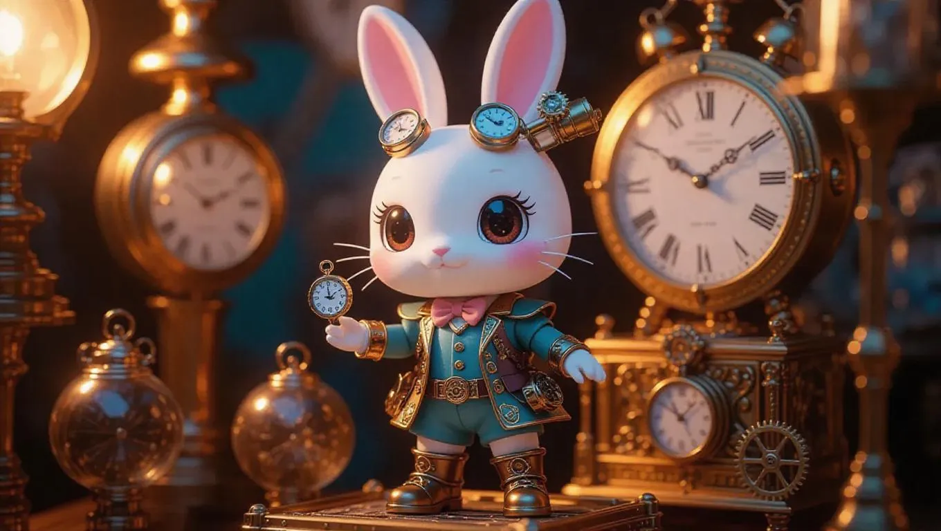 A candy-coated bunny action figure dressed as a time traveler, featuring carrot-topped ears, a vintage steampunk outfit, and clockwork boots. The toy box is adorned with watercolor-style clock patterns and shimmering iridescent gears, complete with miniature pocket watch accessories. The backdrop showcases a bustling time machine filled with floating cogs and pastel-colored timelines crafting adventures, bathed in vibrant, copper light with a sprinkle of history. Style: Chibi anime with enchanting, temporal charm.