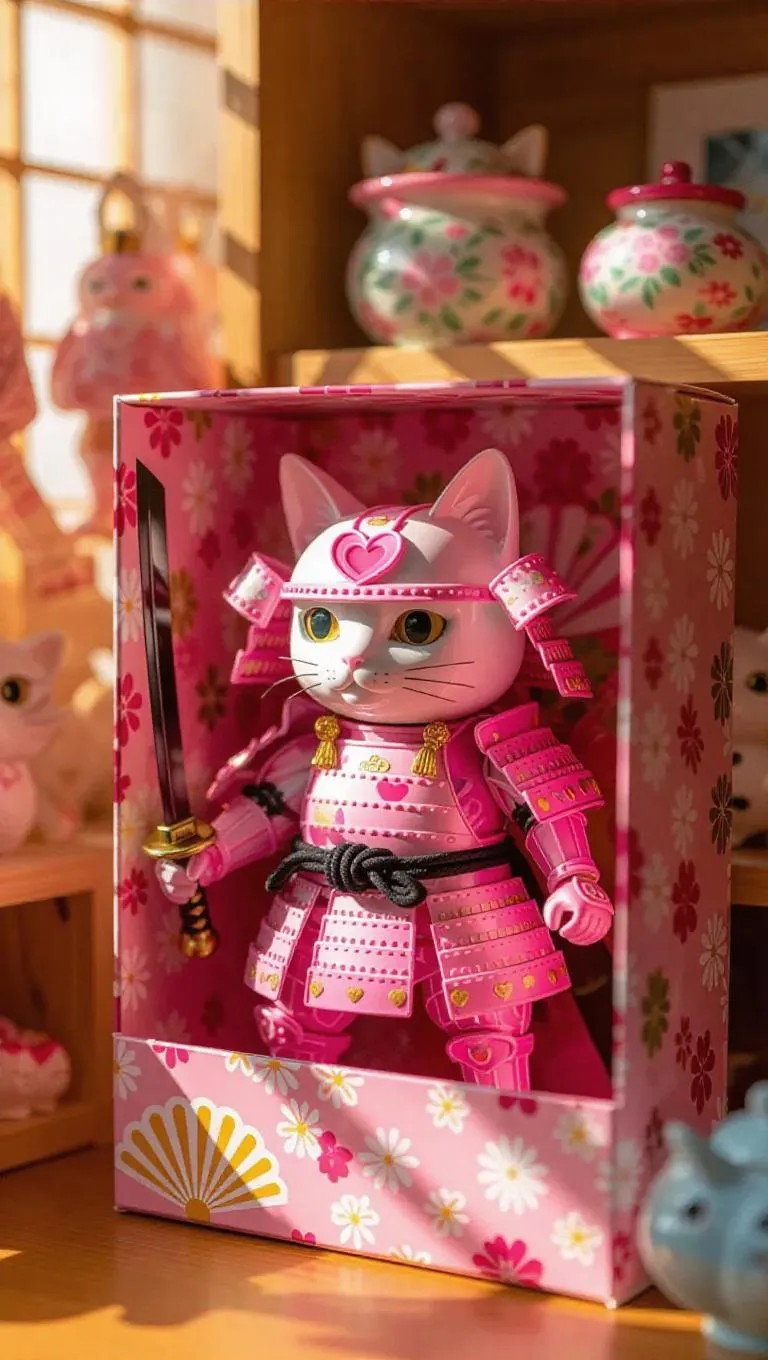 A samurai cat warrior toy clad in lacquered pink armor adorned with heart patterns and no blade tails. The box features traditional fans, Japanese floral stamps, and a paper pouch. Set against a busy crafting area with stacked toy shelves, the scene is illuminated by bright, cheerful light, casting playful shadows that enhance the toy's detailed craftsmanship. Style: Realistic.