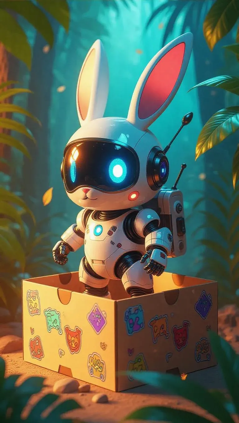 An anime-styled robot bunny with propeller ears, a jetpack tail, and holographic eyes stands in an adventure-themed box adorned with treasure maps, glowing stickers, and explorer decals. The background features a bunny-themed jungle, with floating leaves adding a whimsical touch. Soft, warm light enhances the jungle colors, creating an adventurous and vibrant atmosphere. The style is playful and cartoonish, with clean lines and exaggerated features.
