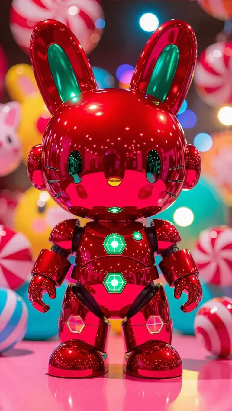 A radiant red and emerald robotic Hello Kitty mech figure with rabbit ears and a bubble-launching bow stands prominently. The figure's packaging is illustrated with candy-themed designs and hexagram-shaped holographic labels, including supplementary gear features. The background presents a joyful toy fair, filled with bouncing mechanical candies and a festive, jubilant atmosphere. Bright, cheerful light casts vivid highlights on the figure, enhancing its glossy exterior. The style is a mixture of adorable and carnival-like, infused with fun.