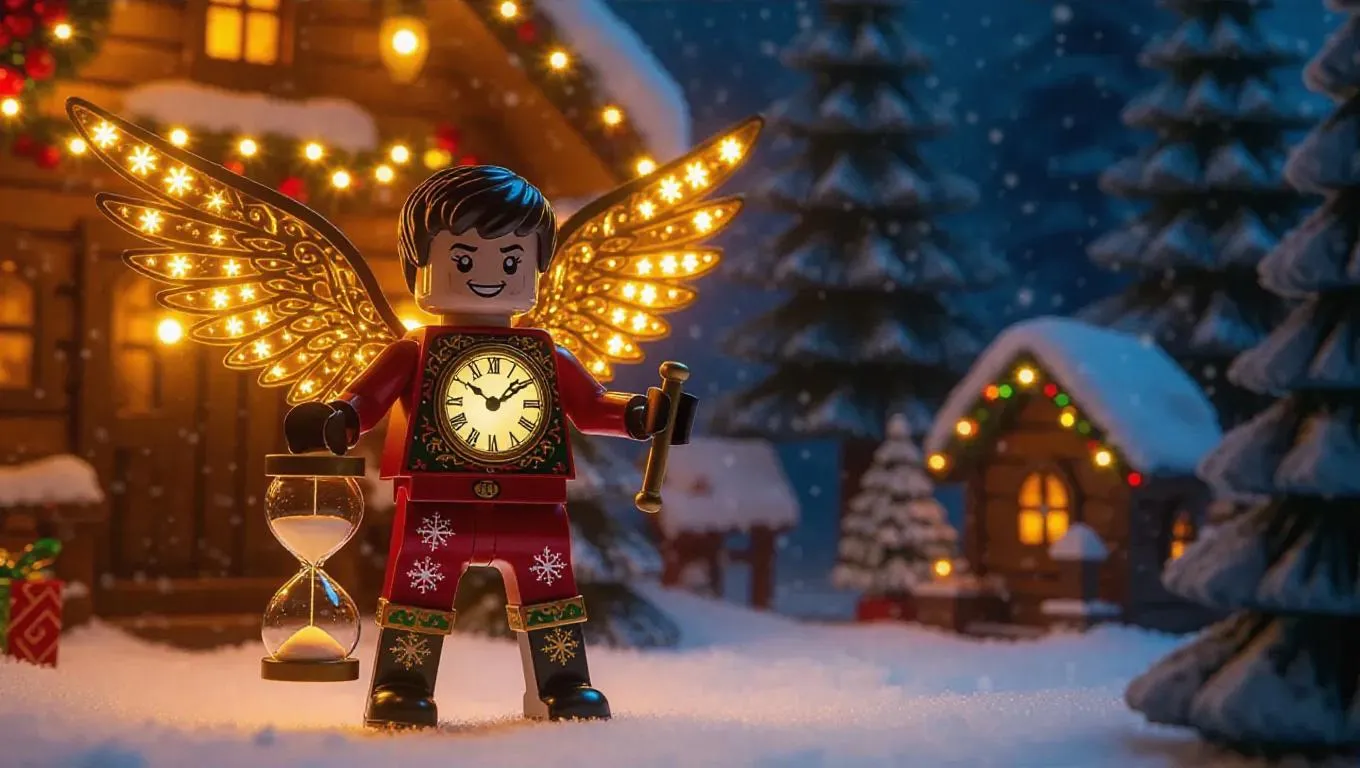A time traveler action figure with intricate clock-shaped wings and an hourglass staff glowing with radiant golden light. Wears a festive outfit adorned with holiday motifs. The toy box showcases a winter wonderland design. Background: A cozy cabin filled with snowflakes, warm lights, and holiday decorations. Style: Heartwarming.