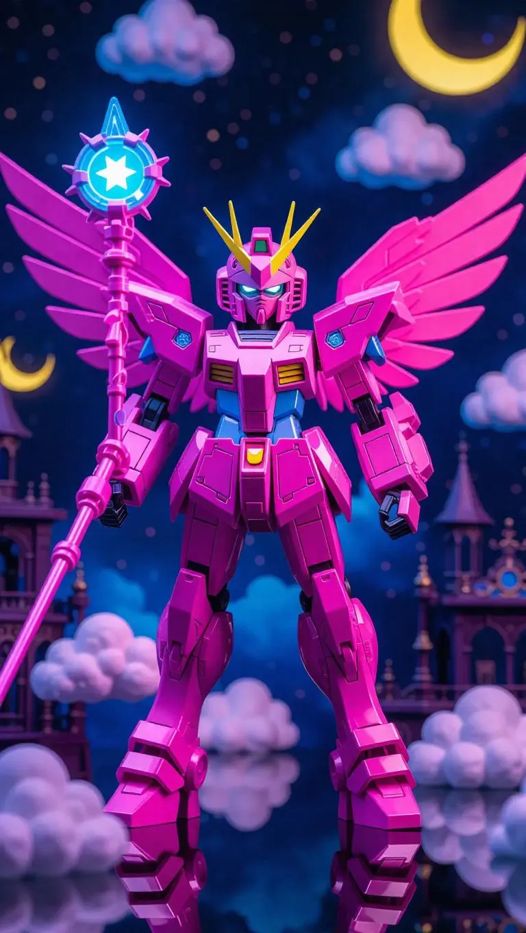 A high-gloss pink and sky-blue robotic Sailor Cloud mech figure with crescent moon wings and a cloud-launching wand stands prominently. The packaging is adorned with cloud-themed designs and crescent moon-shaped holographic labels, featuring bonus gear arms. The background showcases a magical toy factory filled with floating mechanical clouds and a whimsical, celestial atmosphere. Soft, warm light casts gentle highlights, enhancing the figure’s glossy finish. Style: Cute and futuristic with a touch of cyberpunk flair.