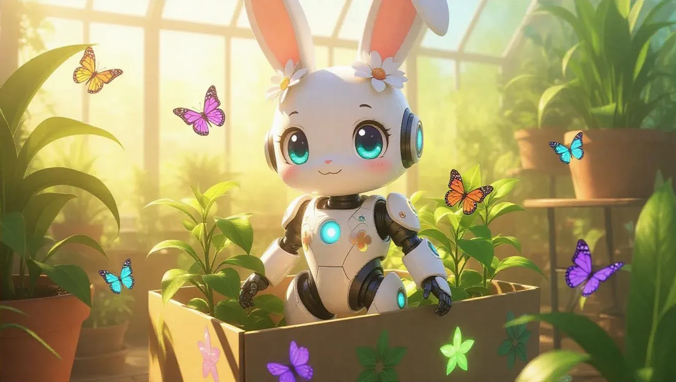 An anime-styled robot bunny with flower ears, a jetpack tail, and twinkling eyes stands in a gardening-themed box adorned with plants, glowing stickers, and planting decals. The background features a bunny-themed greenhouse, with floating butterflies adding a whimsical touch. Soft, warm light enhances the green colors, creating a fresh and vibrant atmosphere. The style is playful and cartoonish, with clean lines and exaggerated features.