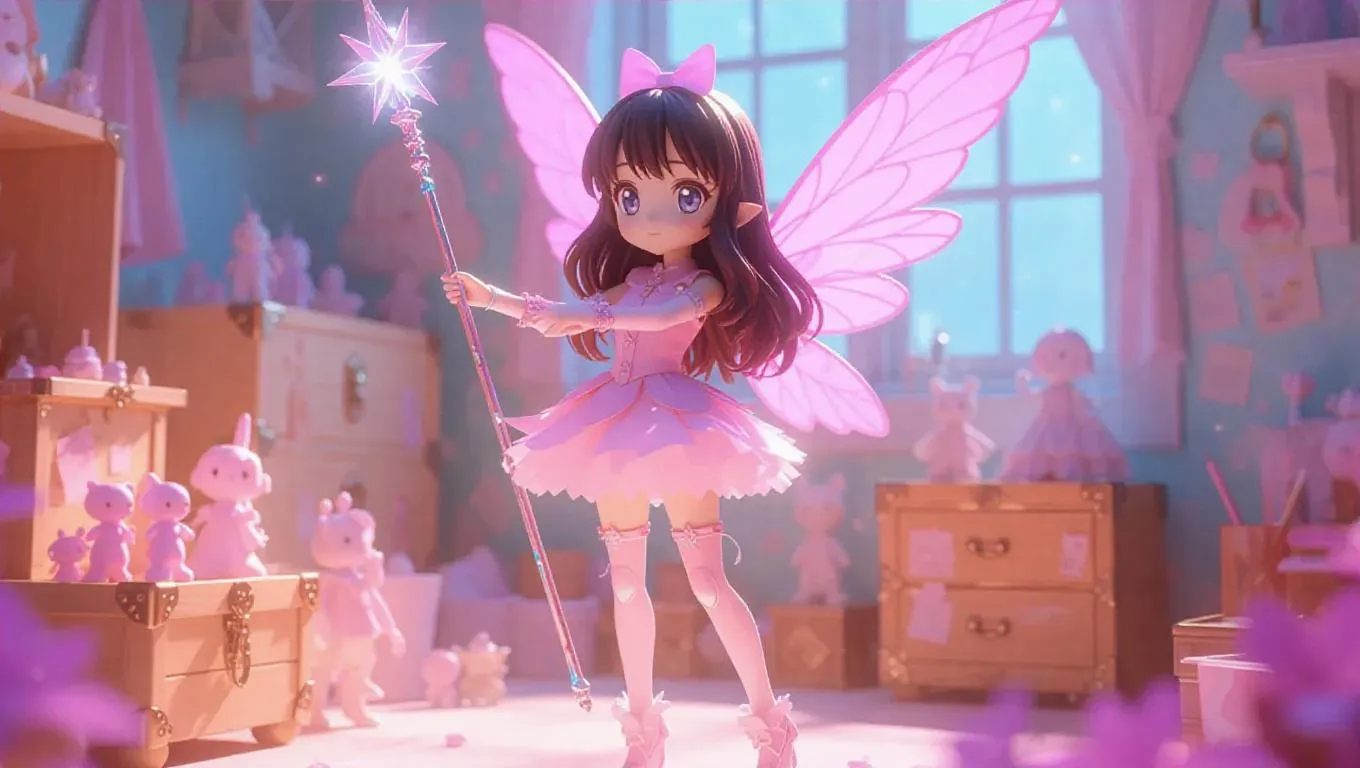 A magical girl action figure with soft pink wings, a fairy-like staff, and sparkling eyes stands in a charming pose. Her toy box is decorated with lovely ribbons and features her in a graceful magical stance, complete with bonus sparkle whip accessories. The background is a dreamy toy workshop, aglow with gentle, pastel light that highlights the colors and adds a lovely aura. Style: Realistic with fairy tale elements.