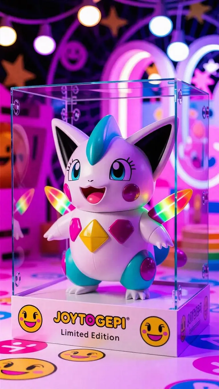 An anime-style collectible action figure of Togepi, redesigned as a bubbly tech mascot with colorful armor plates, glowing pastel eyes, and robotic joy tails. The figure is displayed inside a transparent premium toy box with bright white linings, festive stickers, and "JoyTogepi Limited Edition" branding. The background features a cheerful holo-playground with playful light installations and joyful emojis, illuminated by soft pastels and vibrant colors, creating a playful and delightful atmosphere. The lighting is a mix of ambient and playful spotlights, enhancing the figure's cheerful details. Style: Cyberpunk.