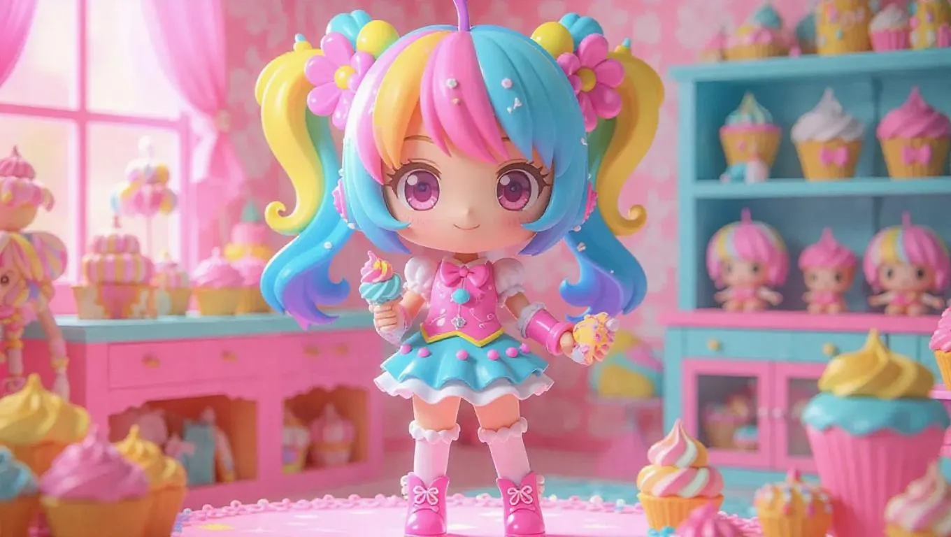 A candy-colored anime girl action figure, dressed as a magical confectioner, sports frosting-themed hair, a sweet fruit wand, and creamy boots. The toy box showcases bright patterns and shiny whimsical candy colors, along with bonus mini-figures. The background depicts a radiant candy workshop creating sweets-themed toys, bathed in enchanting, warm light with a touch of shiny highlights. Style: Chibi anime with a colorful, fantastical aesthetic.