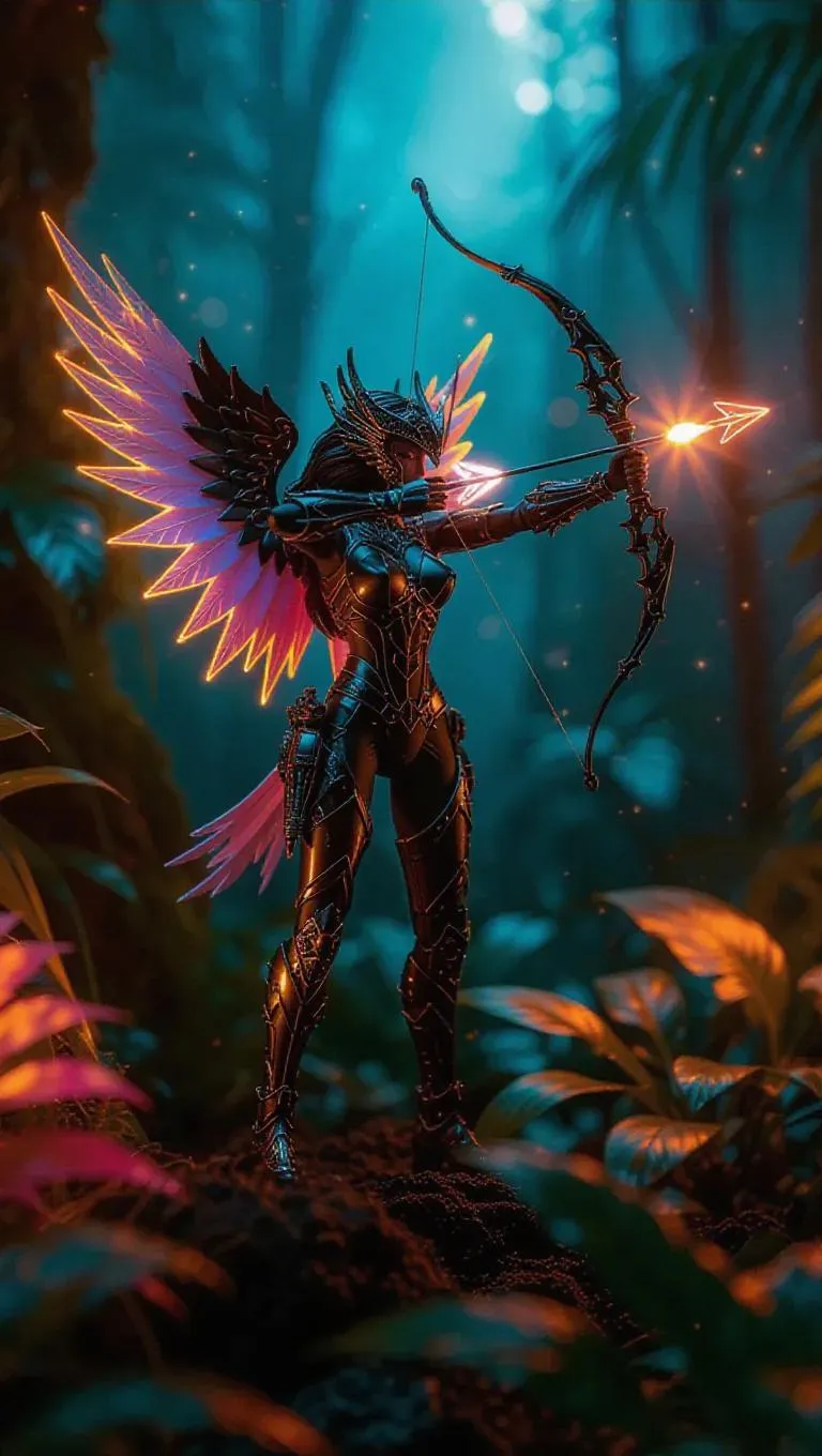 A celestial archer action figure with radiant star-shaped wings and a bow emitting cosmic energy, clad in an outfit adorned with solar flares. Toy box features a dynamic cosmic scene. Background: A vibrant jungle with bioluminescent plants and colorful creatures. Style: Hyper-realistic with a jungle fantasy twist.