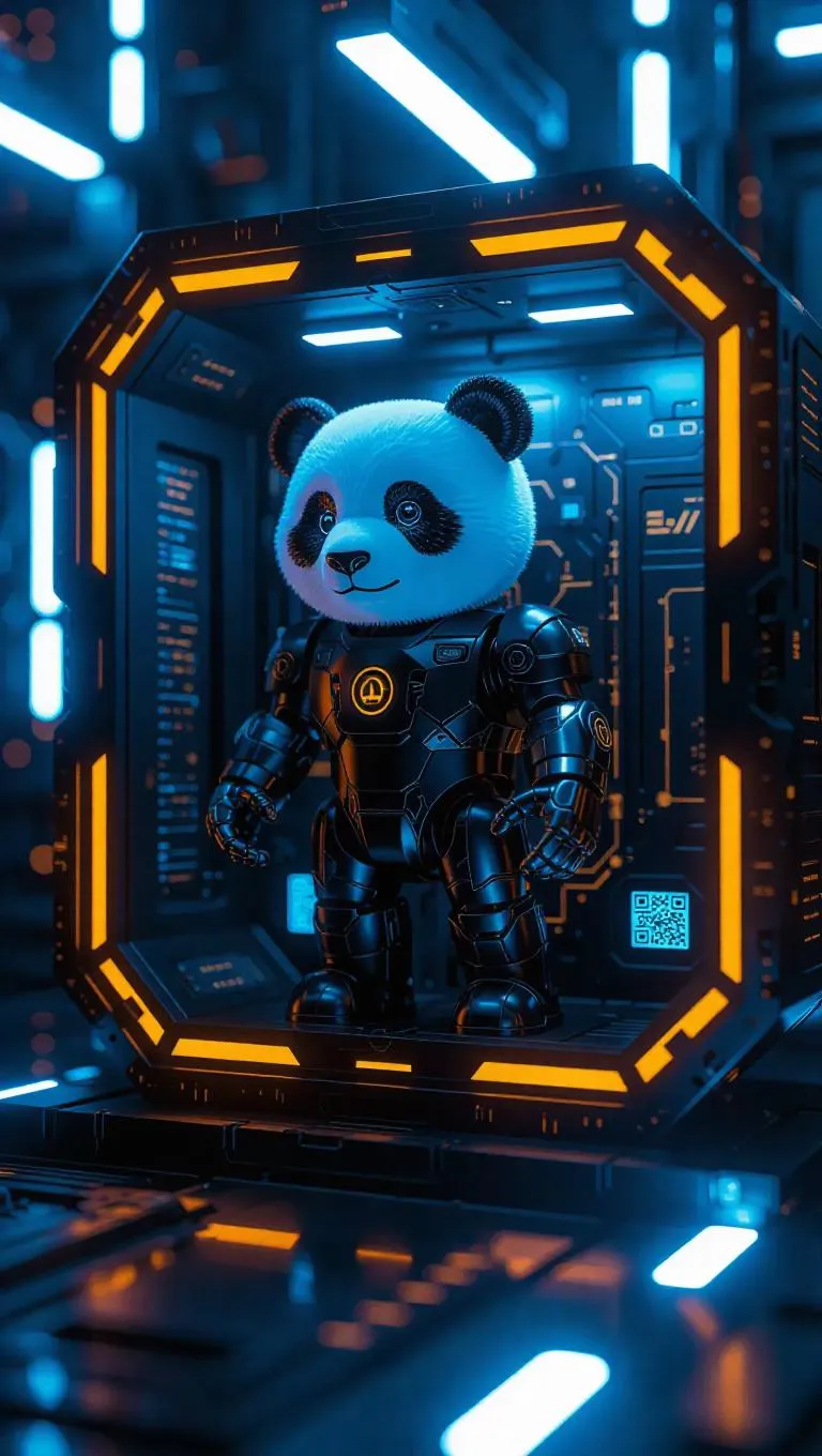 A toy robot panda with deep indigo and electric yellow panels stands on a rotating platform inside its packaging. The box pulses with kinetic energy effects, featuring modern logos and a QR code that unlocks power-ups. Set in a sci-fi toy assembly facility, the scene is illuminated by stark, blue lights casting intense shadows, emphasizing the otherworldly and cutting-edge setting. The style is dynamic and imaginative, blending realism with sci-fi aesthetics.