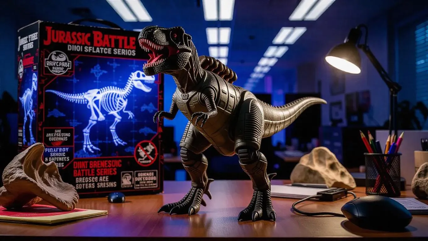 An armored T-Rex action figure with jet propulsion for feet and a grenade-laden spine stands defiantly in a dino-themed office. The figure's packaging displays digital dinosaur skeleton overlays, safety warnings, and "Jurassic Battle Series" branding. Prehistoric fossils and office gadgets clutter the background, highlighted by bright, fluorescent office lighting. The scene conveys an energetic fusion of ancient and modern elements, with a dynamic style that focuses on the intricacies of the mech and the office context.