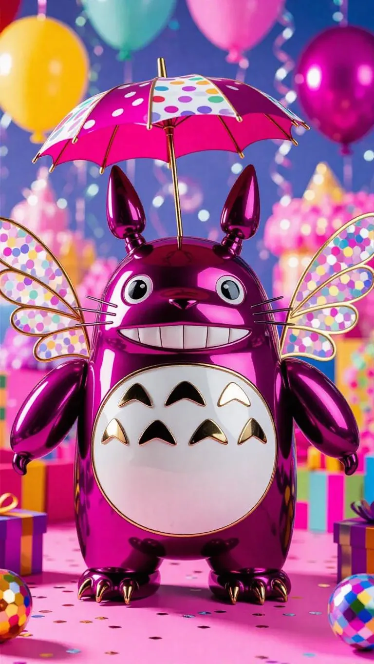 A shiny magenta and gold robotic Totoro mech figure with jeweled wings and a confetti-launching umbrella stands prominently. The packaging features party-themed designs and balloon-shaped holographic labels, including bonus gear noisemakers. The background showcases a festive toy party with floating mechanical balloons and a cheerful, celebratory atmosphere. Soft, sparkly light casts festive highlights, enhancing the shiny finish. Style: Fun and radiant with a touch of celebratory flair.