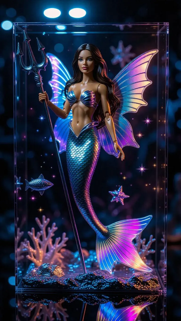 A galaxy-themed mermaid action figure with translucent fins and glimmering star freckles, holding a mystical trident. The packaging features colorful constellations, radiant foil, and aquatic accessories. The background showcases a toy factory shaped like a giant angelfish, illuminated by the soft, twinkling starlight. Natural, soft front light enhances the mermaid's iridescent scales and the shiny packaging, creating a magical and serene atmosphere. Style: Enchanted realism.