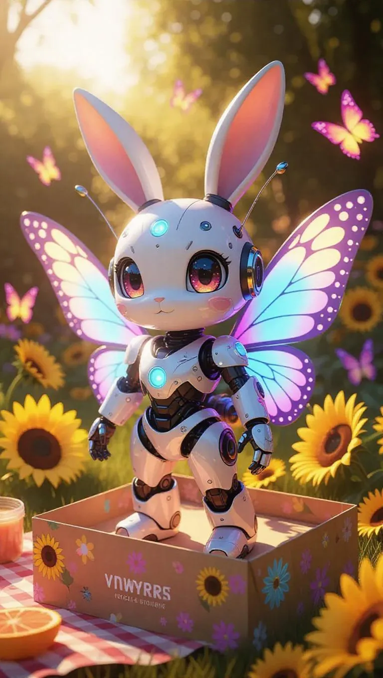 An anime-styled robot bunny with butterfly wings, a jetpack tail, and holographic eyes stands in a summer-themed box adorned with sunflowers, glowing stickers, and vibrant decals. The background features a bunny-themed picnic setup, with floating fruit slices adding a whimsical touch. Soft, warm light enhances the bright colors, creating a cheerful and vibrant atmosphere. The style is playful and cartoonish, with clean lines and exaggerated features.