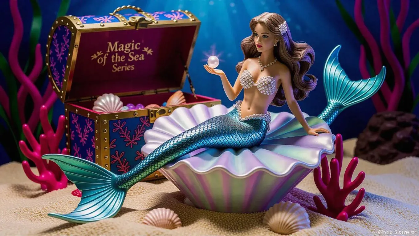 A highly detailed figure of a mermaid enchantress, her long, flowing taupe hair cascading over her shapely form. Seated on a large, iridescent seashell, her fishtail curls gracefully around her. Pearl-encrusted netting adorns her top, and her tail shimmers with scales in shades of silver and cerulean. Holding a glowing pearl, emitting a soft, otherworldly light. The toy box resembles an underwater treasure chest, textured like coral and seashells, with "Magic of the Sea Series" emblazoned on the front. Enchanted grotto background, teeming with swirling bubbles and vibrant starfish. Gentle, filtered twilight creates a dreamy, ethereal glow, enhancing the magical and otherworldly elements.