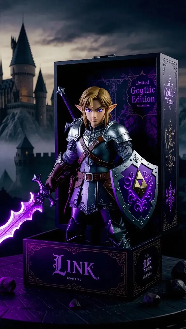 A gothic-inspired collectible action figure of Link, encased in a dark, ornate toy box. Link's gothic redesign features tarnished silver armor, glowing purple eyes, and leather accents. His Master Sword is adorned with dark runes and violet energy cores, while his shield is enhanced with elaborate romantic elements. The packaging showcases elegant, gothic-style fonts, dark illustrations of Link in fierce battle poses, and a holographic 'Limited Gothic Edition' sticker. Included accessories: Triforce launcher, enchanted bow. Background: ancient Hyrule Castle, foggy landscape, dawn. Style: gothic, high detail, dramatic lighting, monochrome.
