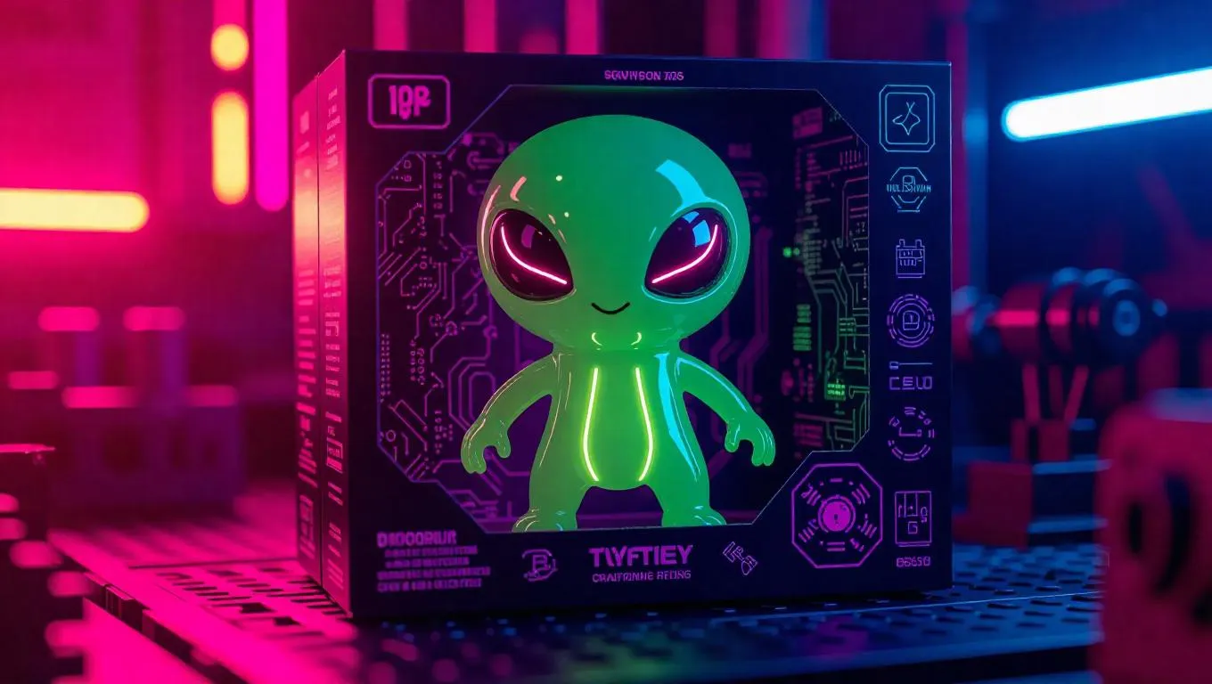 A toy alien jelly figure made of gel-like material, featuring glowing eyes and pulsing goo trails. The box is illustrated with cyberpunk-themed graphics, including a circuit board-shaped accessory and holographic elements. The factory setting is a high-tech toy manufacturing zone, filled with robotic arms and neon lights. Dynamic, colorful lighting enhances the gelatinous texture, creating an exciting and futuristic atmosphere. The style is edgy and slightly avant-garde, blending technology with cartoonish features.