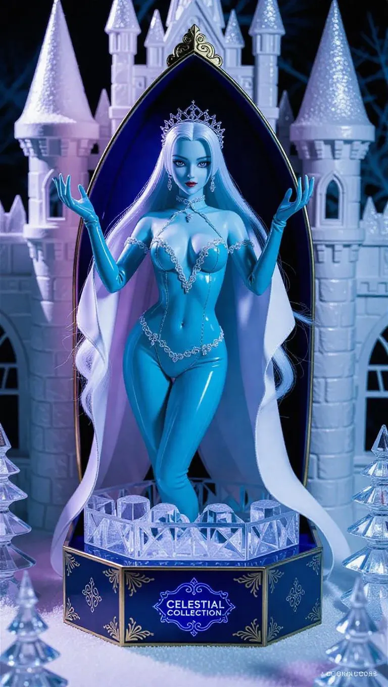 A highly detailed anime-style collectible figure of a regal ice queen with pale blue skin, long flowing white hair, and glowing silver eyes. She wears a revealing icy-blue latex outfit with diamond lace trim, posed majestically on a frosted glass base. The figure is packaged in a majestic toy box with shimmering inner lining, platinum embossing, and a holographic "Celestial Collection" label. Set against a winter-themed toy castle with glimmering ice sculptures and frosty shadows. Soft, ethereal light casts gentle highlights on her form, enhancing her elegance. Style: anime, with a touch of ice magic and ethereal elements.