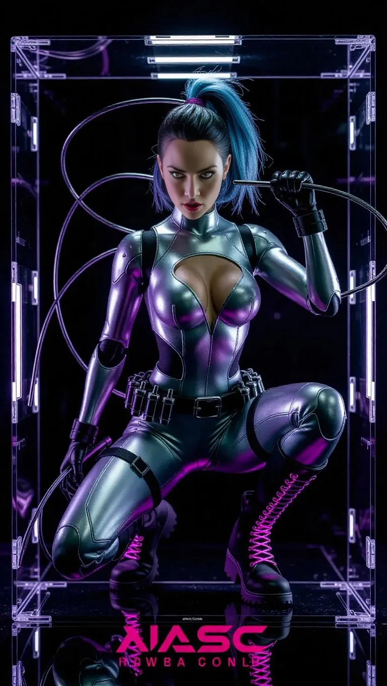 A sleek, futuristic female android action figure in a form-hugging, silver catsuit with cut-out sections exposing her cybernetic enhancements. Combat boots with neon-purple accents, utility belt with miniature grenades. Medium-length, icy-blue hair in a messy bun, cat-like, glowing yellow eyes. Dynamic, crouching pose, holding a high-tech whip. Transparent, rectangular packaging with rotating LED lights, highlighting the sheen and sleek lines, exuding a rebellious, edgy vibe.