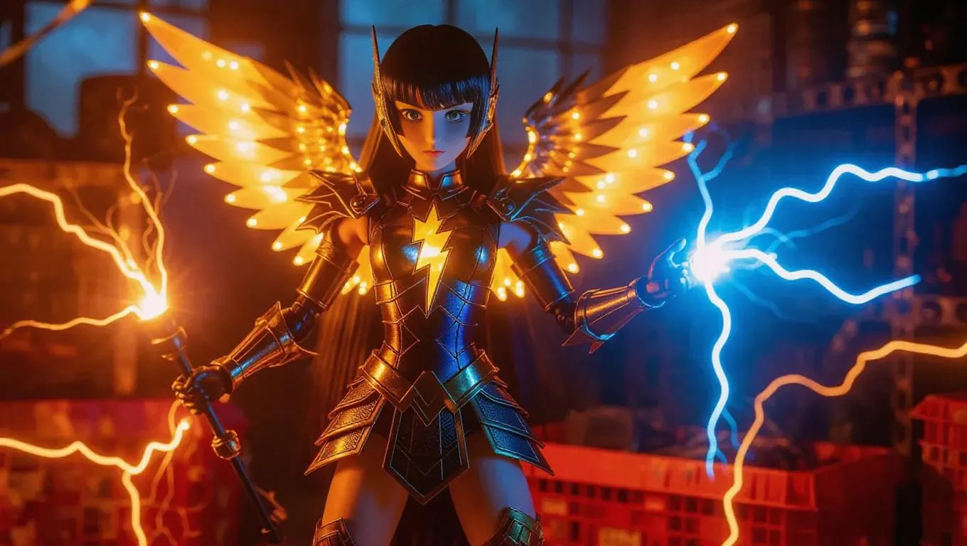 A magical girl action figure with glowing brass wings, a thunder staff, and sparkling eyes stands in an electrifying pose. Her toy box is adorned with lightning motifs and features her in a charged magical stance, complete with bonus electric blast accessories. The background is a high-energy toy workshop, lit with intense lighting that increases the vibrancy of the colors and evokes excitement. Style: Realistic with a powerful fantasy.