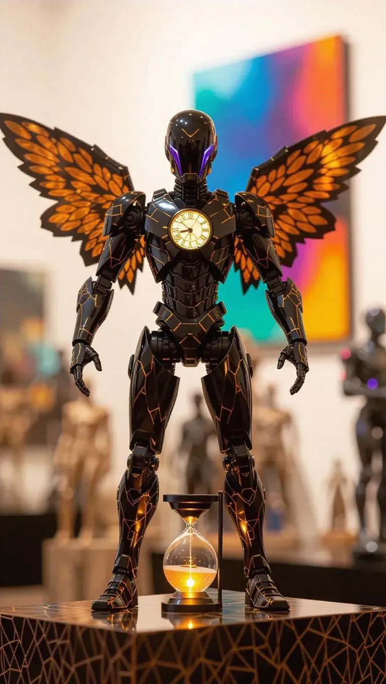 A time traveler action figure with intricate clock-shaped wings and an hourglass staff glowing with radiant golden light. Wears a minimalist outfit adorned with geometric shapes. The toy box showcases an abstract art design. Background: A modern art gallery filled with sculptures, vivid colors, and thought-provoking pieces. Style: Abstract.