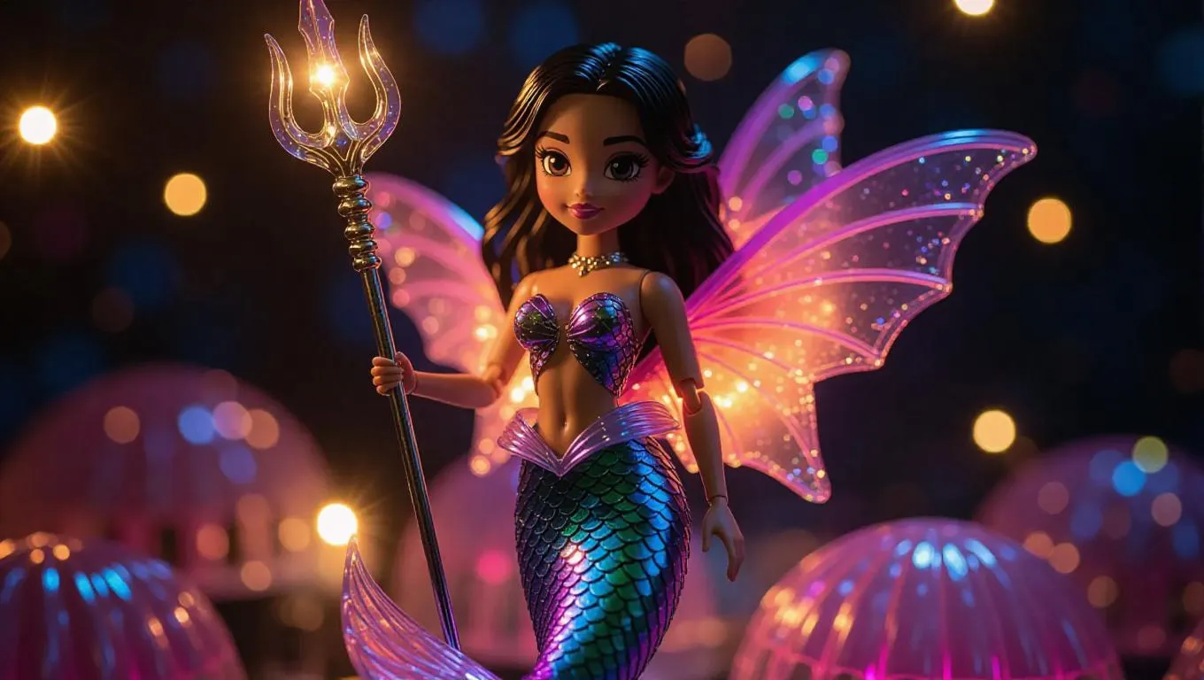 A galaxy-themed mermaid action figure with translucent fins and glittering star freckles, holding an ethereal trident. The packaging features constellation motifs, rainbow foil, and aquatic accessories. The background showcases a toy factory resembling a giant jellyfish, illuminated by the soft, twinkling starlight. Natural, soft front light enhances the mermaid's radiant scales and the glossy packaging, creating a magical and serene atmosphere. Style: Enchanted realism.