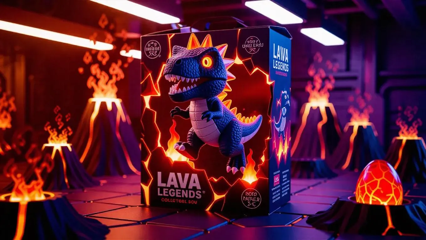 A chibi dinosaur toy in lava armor with translucent fire spikes and glowing red eyes, posed in an athletic jump. The toy box features erupting volcano graphics and "Lava Legends" branding, including a collectible ember egg. Set in a factory with a glowing production environment, bubbling magma flows, and radiant cracks, the scene is illuminated by warm, vivid light casting intriguing shadows. Style: vibrant and lively, with a hint of excitement.