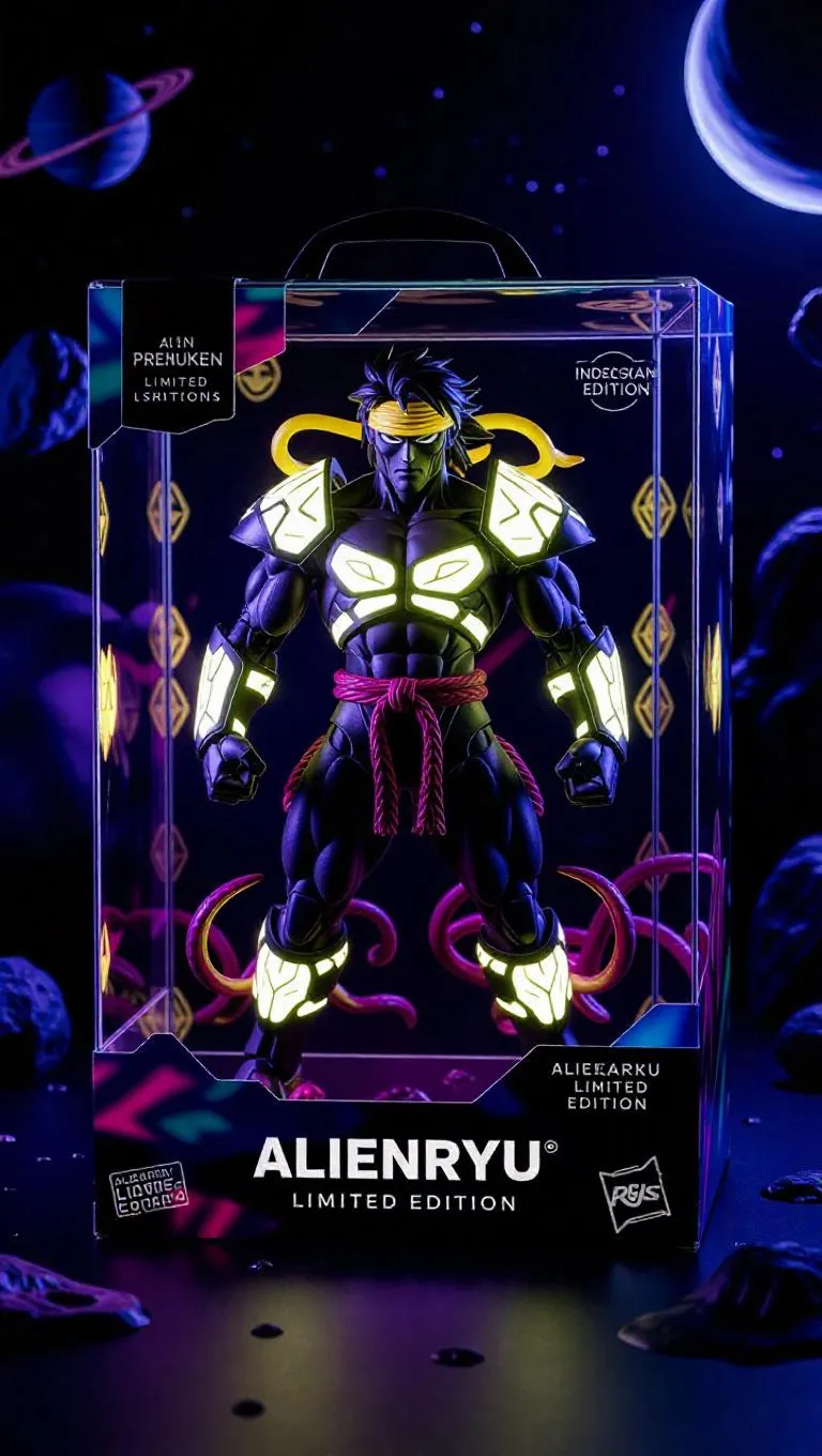 An anime-style collectible action figure of Ryu, reimagined as an alien warrior with bio-luminescent armor plates, glowing yellow headband, and tentacle fists. Displayed inside a transparent premium toy box with iridescent linings, Hadouken stickers, and 'AlienRyu Limited Edition' branding. Intergalactic background with glowing planets, floating space debris, and extraterrestrial aesthetics.